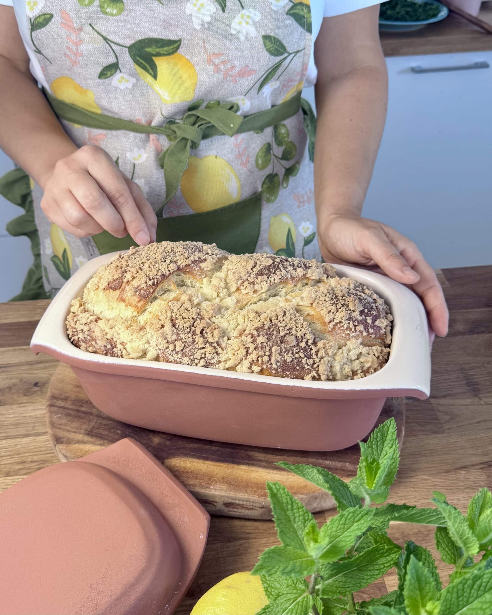 Od jakiegoś czasu testuję różne metody pieczenia, ale jeden sposób wraca do mnie niezmiennie – pieczenie w garnku rzymskim. To naturalna forma, która oddycha, utrzymuje wilgoć i pozwala na pieczenie bez użycia chemicznych powłok. Mój model od Jelux jest szkliwiony od środka, dzięki czemu nie trzeba go moczyć, a ciasto i tak wychodzi perfekcyjne – sprężyste, wilgotne, z chrupiącą kruszonką i bez efektu przesuszenia.