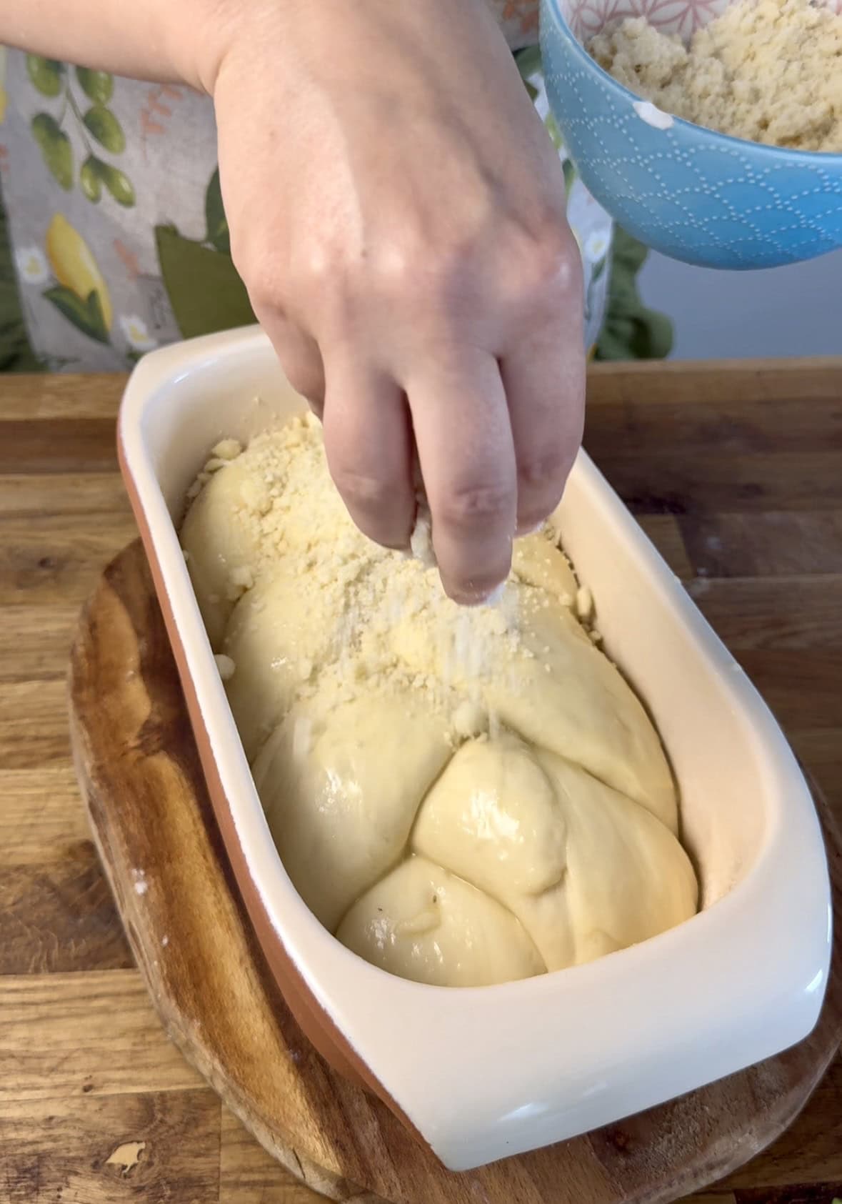 Po wyrośnięciu podziel ciasto na 3 równe części i uformuj wałki. Zapleć je w warkocz i przełóż do wysmarowanego masłem garnka rzymskiego.